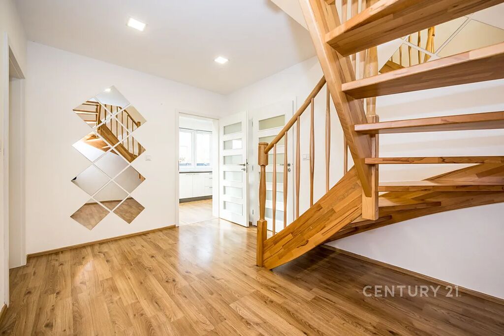Přízemí: obývací pokoj s vstupem na terasu, kuchyně s jídelnou, technická místnost, dílna, samostatná toaleta, chodba s dřevěným schodištěm