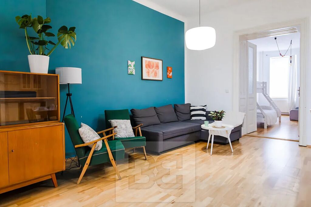 Koupelna s vanou a samostatná toaleta. Pokoje jsou prostorné s možností úložných prostor v nikách. Dvě ložnice jsou orientovány do ulice Vachova. Třetí ložnice je orientovaná do vnitrobloku. Byt je vybaven v minimalistickém stylu s retro prvky.