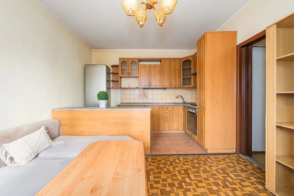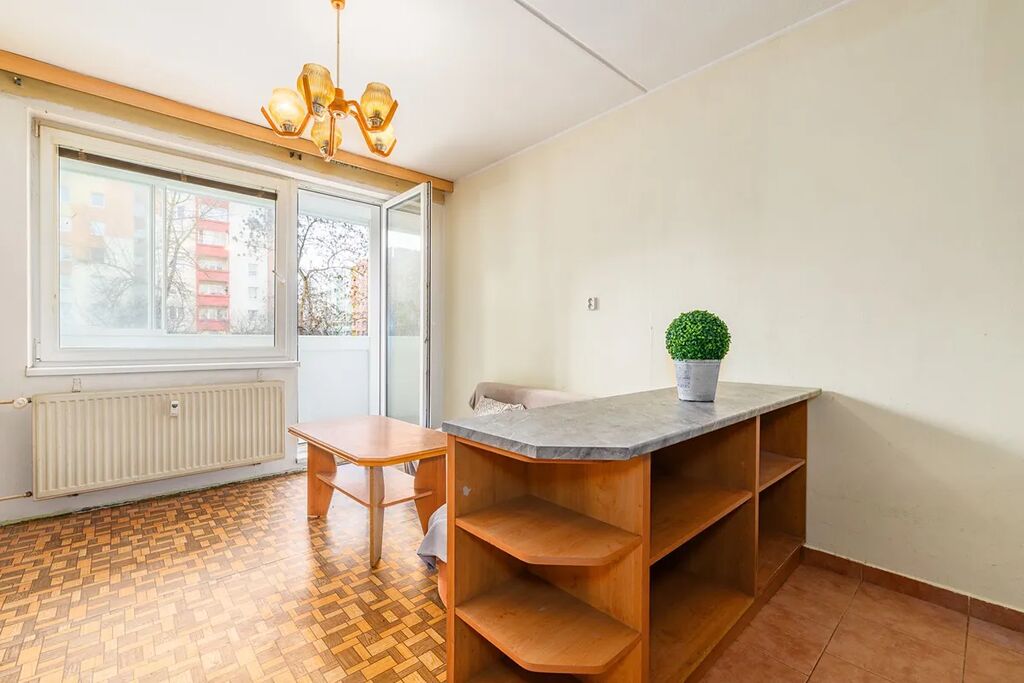 Byt je ve v částečně zrekonstruovaném stavu a nabízí příjemně světlý interiér s praktickým rozmístěním jednotlivých místností. Dominantou je prostorný obývací pokoj navazující na kuchyňský kout se spotřebiči, dále se zde nachází ložnice, koupelna, samostatná toaleta a dostatek úložných prostor. K bytu náleží zasklená lodžie a sklepní kóje.