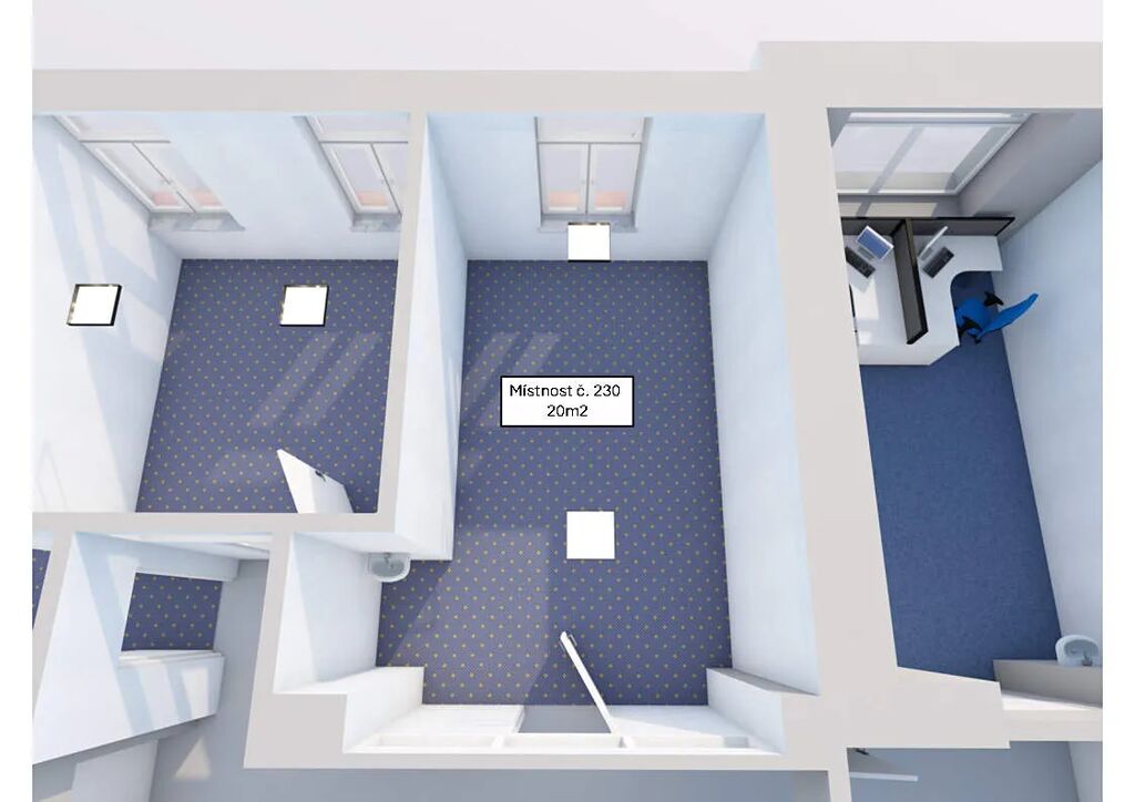Nabízíme k pronájmu místnost s celkovou plochou 20 m2. Místnost se nachází v prvním poschodí obchodního centra Frýdečanka. Prostory jsou vhodné například pro kancelářský provoz nebo provozování služeb, např. péče o tělo. V budově již fungují tyto služby: solární studio, kosmetika, manikúra, masáže, tetovací salóny atd.