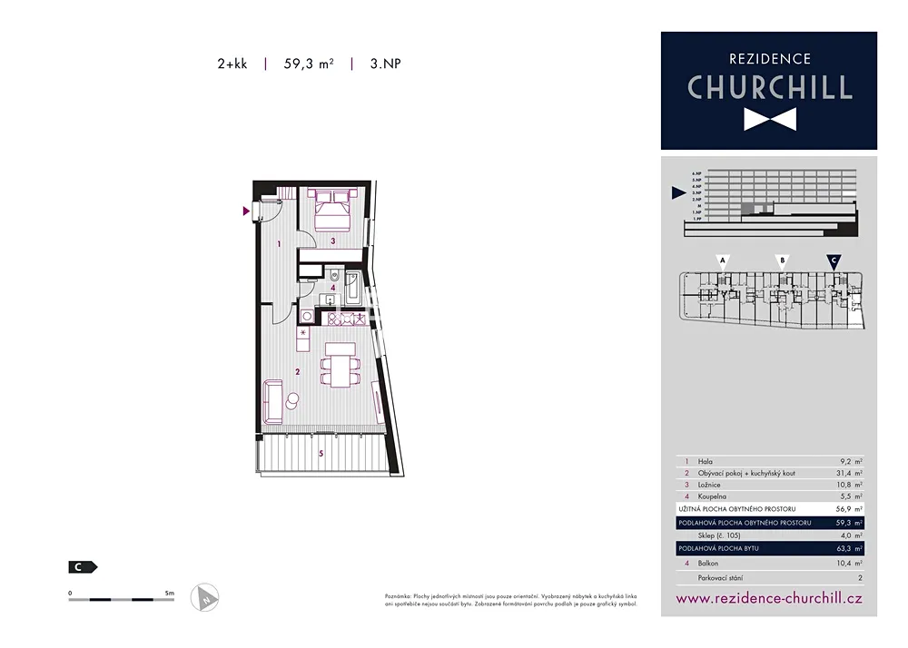Nabízíme zařízený klimatizovaný byt 2+kk k pronájmu o velikosti 59 m2 s balkonem 10 m2, situovaný ve 4. nadzemním podlaží nového rezidenčního projektu Rezidence Churchill, s recepcí, výtahem a 24/7 hod. ostrahou. V okolí bydlení je kompletní občanská vybavenost, výborná dopravní infrastruktura a krásné Riegrovy sady.