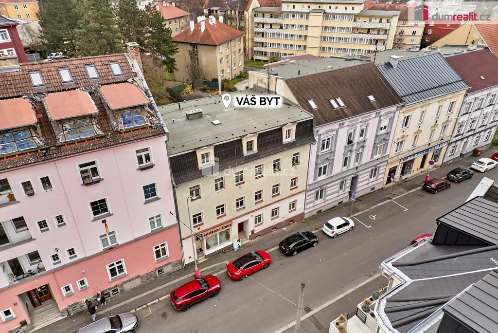 Byt se nachází v podkroví cihlového domu v ulici Klišská, která je součástí oblíbené městské části Klíše.