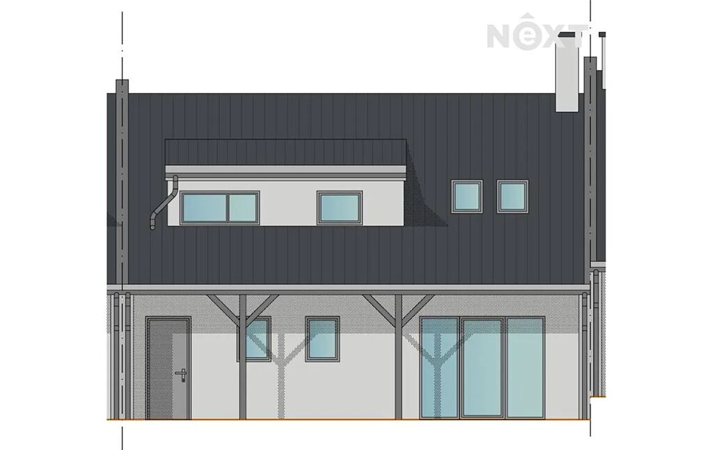 Dispozice domu: 1. NP: Vstupní zádveří navazuje na chodbu se schodištěm, ze které se vstupuje do velkého obývacího pokoje s kuchyňským koutem. Z obytného prostoru je přímý vstup na zastřešenou terasu a zahradu. Z chodby je přístupná garáž, sociální zařízení a také technická místnost s dalším vstupem na terasu.
