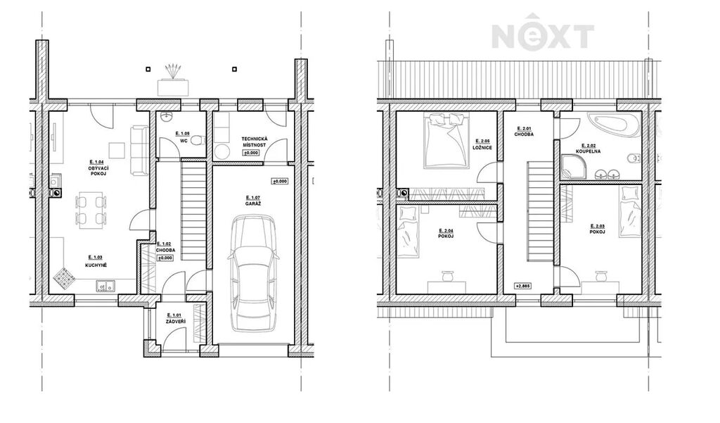 2. NP: Najdete zde tři prostorné ložnice a velkou koupelnu s WC, vanou, sprchou a dvojitým umyvadlem. Z chodby i jedné ložnice je vstup na venkovní balkon s výhledem do klidné části obce.