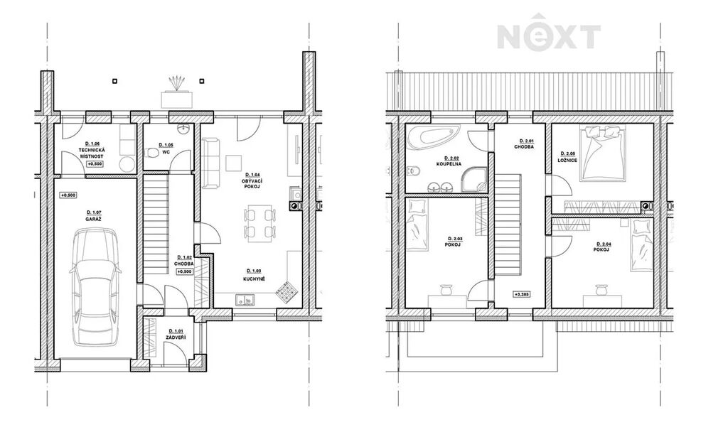 2. NP: Najdete zde tři prostorné ložnice a velkou koupelnu s WC, vanou, sprchou a dvojitým umyvadlem. Z chodby i jedné ložnice je vstup na venkovní balkon s výhledem do klidné části obce.