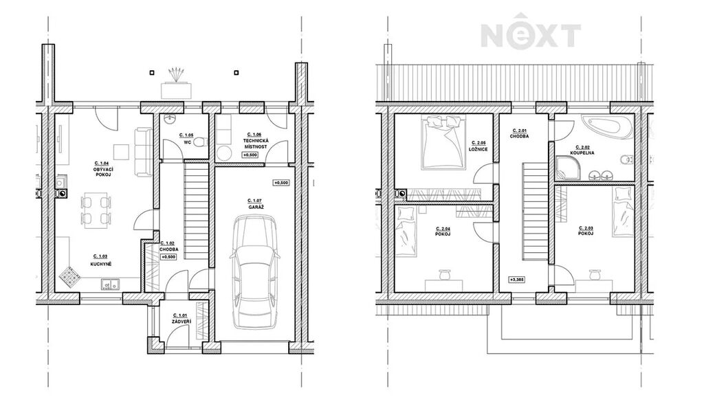 2. NP: Najdete zde tři prostorné ložnice a velkou koupelnu s WC, vanou, sprchou a dvojitým umyvadlem. Z chodby i jedné ložnice je vstup na venkovní balkon s výhledem do klidné části obce.