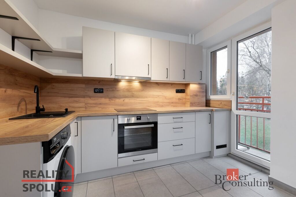 Z kuchyně je vstup na balkon orientovaný směrem k místní komunikaci mezi domy, kde se nachází parkovací stání. Jedná se o převážně klidnou část se vzrostlou zelení. Kuchyňská linka je částečně zařízená a vybavená varnou deskou, pračkou a digestoří. Koupelna je řešena společně s toaletou.