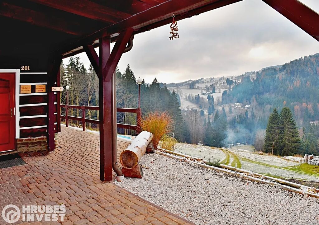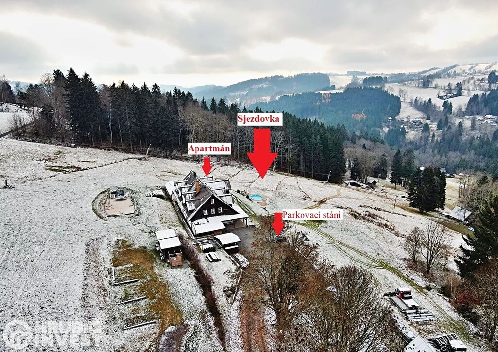 Hledáte opravdu klidné a krásné místo na relax po pracovním týdnu, nebo po vyčerpávající práci místo k odpočinku, k dobití baterek, kde si opravdu odpočinete od všech starostí? Pojďte se s námi podívat do Krkonoš, přímo do Vítkovic na chatu Hubertka, kde najdete jeden apartmán ze sedmi, který může být Váš. Je to jediný apartmán, který se v této chatě prodává. Je to jedinečná šance, koupit pohádkové místo s nádherným výhledem. Chata Hubertka nabízí wellness (Finská sauna, whirlpool, ochlazující bazének s protékající svěží pitnou vodou, …), možnost využít hospůdku s barem, ližárnu. Je zde celoroční vyžití: V létě cyklistika, turistika, v zimě lyžování na několika sjezdovkách (jedna je přímo u chaty), nebo si můžete dojet např. do skiareálu Janova Hora, běžkařské trasy, skialpy, atd. Apartmán s dispozicí 2+kk a výměrou 54 m2 má výhled na sjezdovku, je vybaven kuchyňskou linkou s elektrospotřebiči (myčka, mikrovlnná trouba, indukční varná deska, rychlovarná konvice, kávovar, …), v apartmánu je celkem 5 lůžek, koupelna se sprchovým koutem, toaleta, chodba. K apartmánu náleží jedno parkovací místo před chatou.