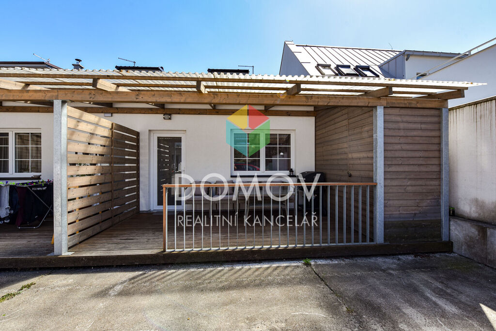 Za domem vás potěší terasa se zastřešenou pergolou a zahradním domkem, ideální pro letní posezení.