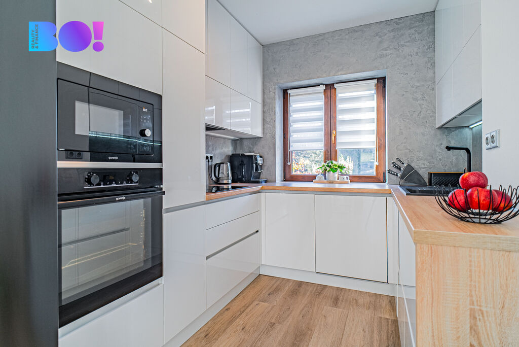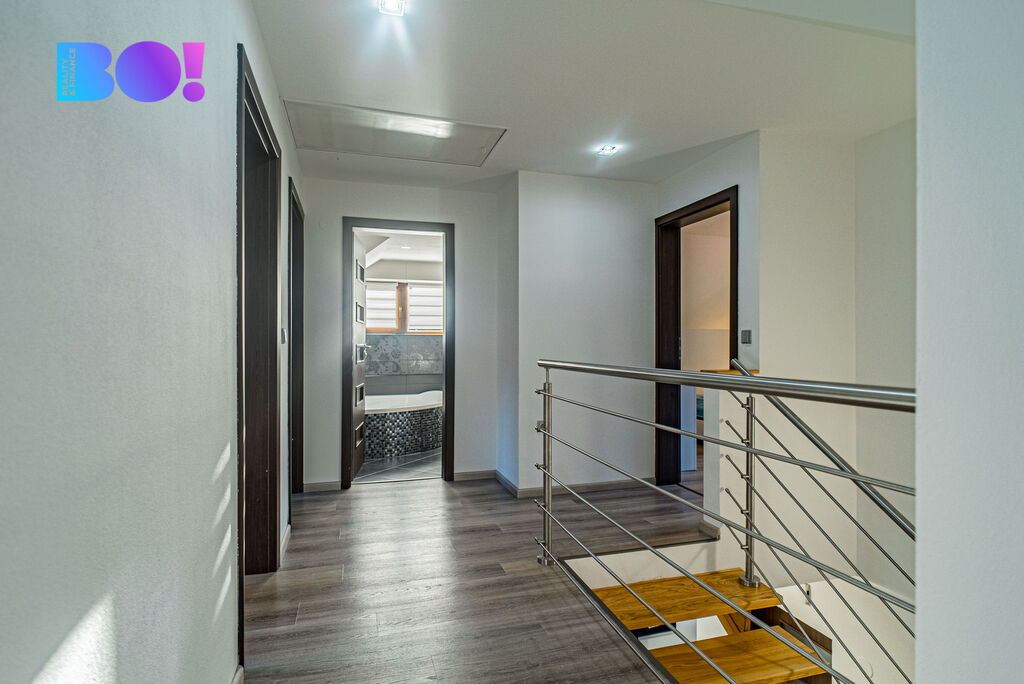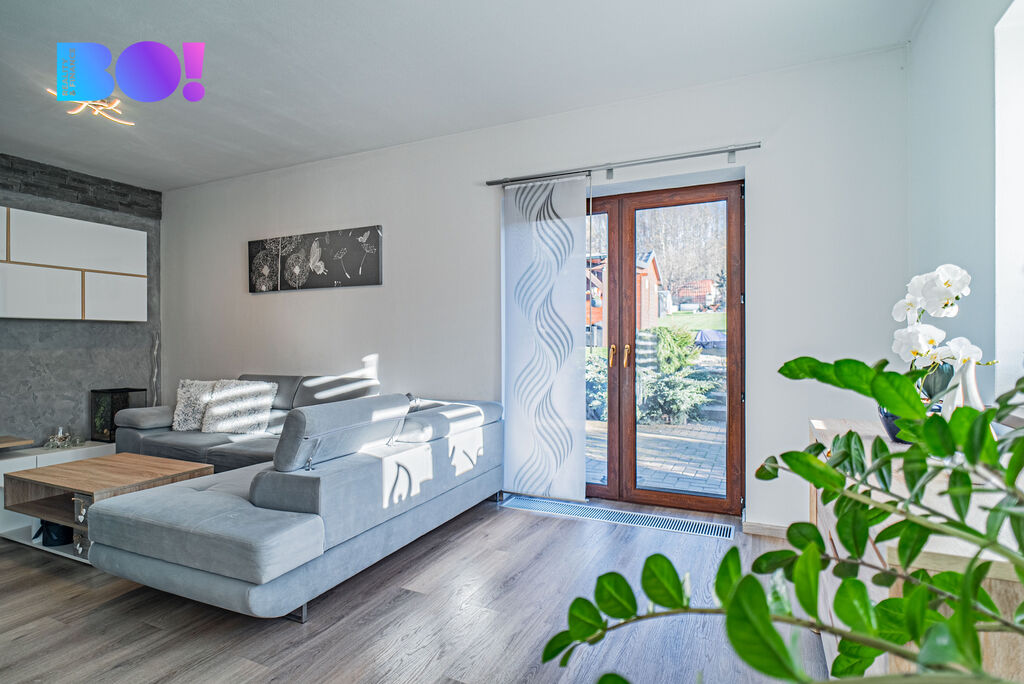 Přízemí domu tvoří prostorný obývací pokoj se vstupem na venkovní terasu, který volně navazuje na jídelní prostor a na novou moderní kuchyň. Kuchyně je kompletně vybavena spotřebiči – indukční varná deska, elektrická trouba, mikrovlnná trouba a myčka. K dispozici je také komora a samostatná toaleta. Podlahy jsou řešeny vinylovou krytinou na klik systém, v koupelně a na WC je položena dlažba. Dřevěné schodiště vede do prvního patra, kde se nacházejí dva dětské pokoje – každý s vlastním balkonem, ložnice se šatnou a balkonem a další pokoj vhodný jako pokoj pro hosty, pracovna nebo budoucí koupelna (příprava je hotová).