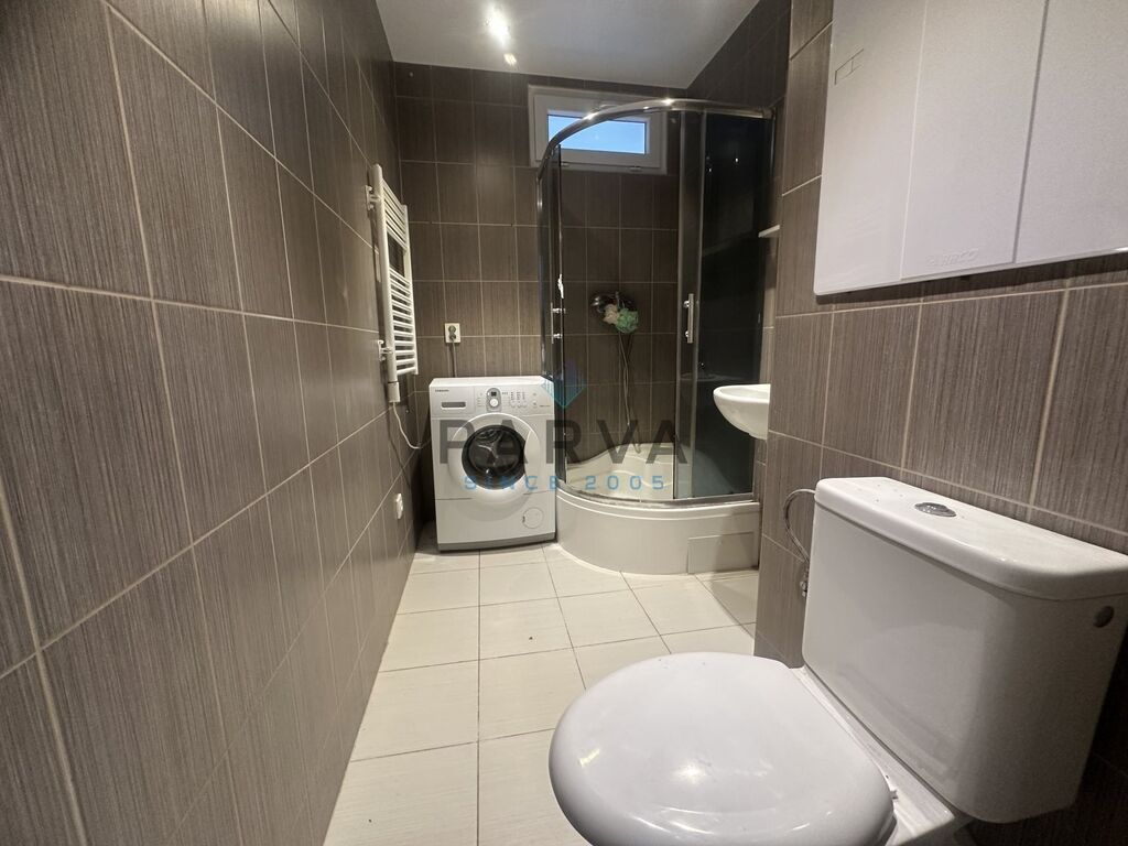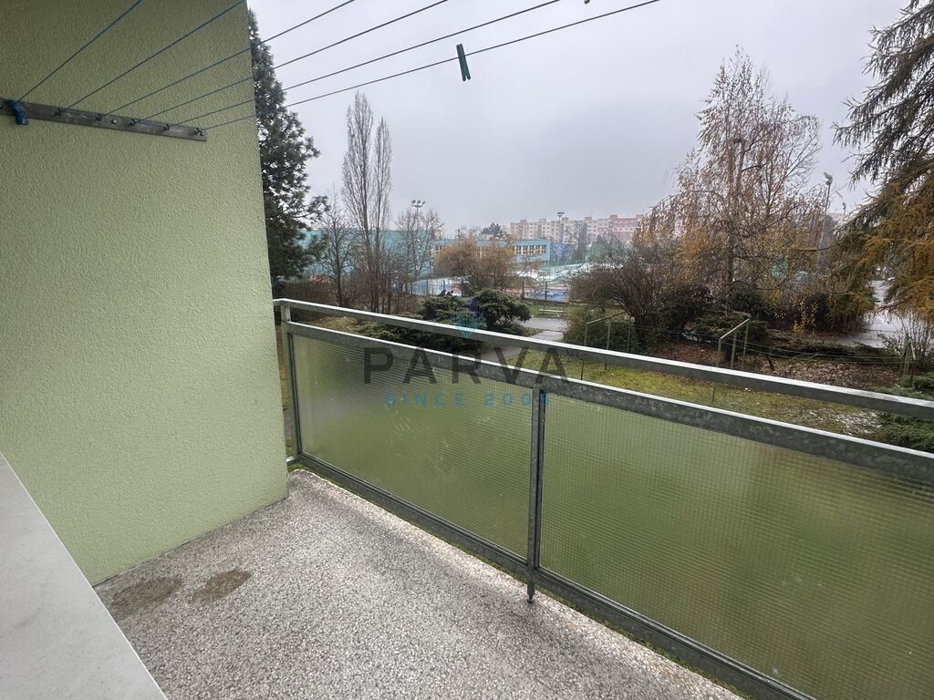 Prostorný obývací pokoj se vstupem na lodžii. Koupelna a WC po kompletní rekonstrukci – nově spojeny do jedné moderní místnosti, vybavené sprchovým koutem, umyvadlem a pračkou