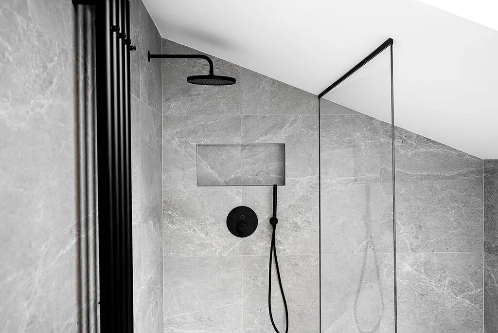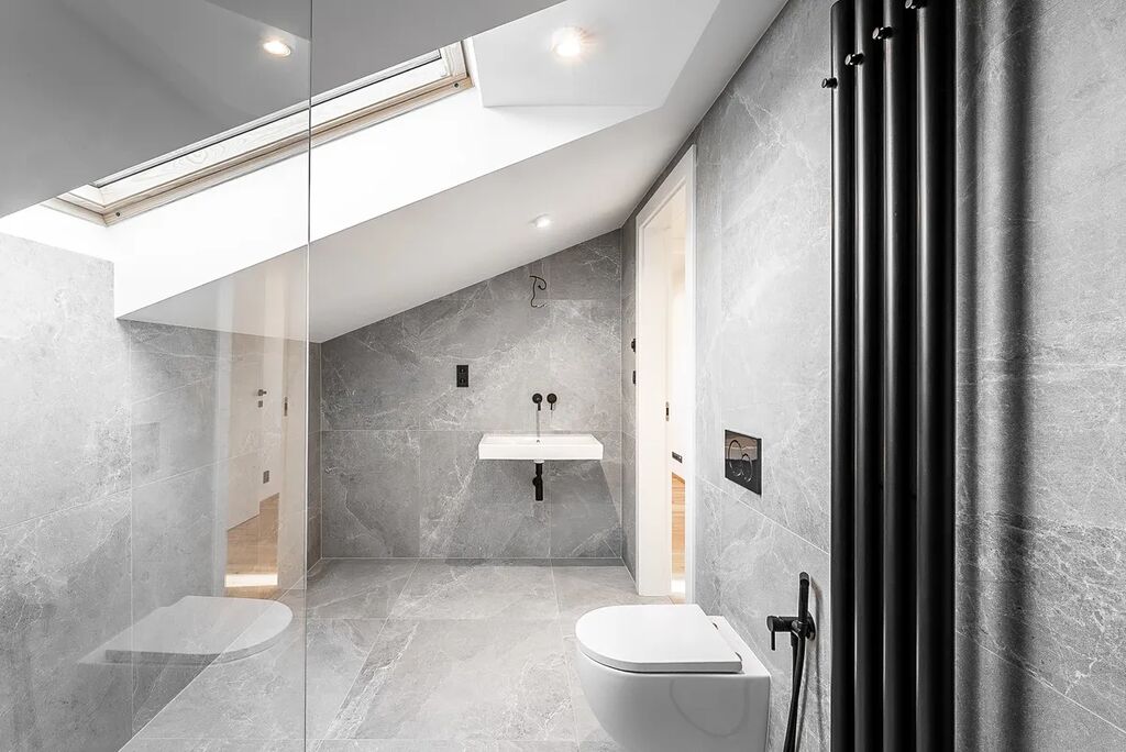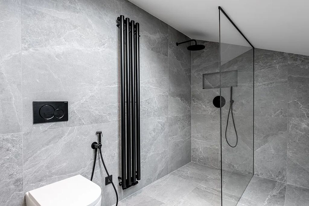 Koupelny s italskou velkoformátovou dlažbou a podomítkovými bateriemi působí elegantně, přitom funkčně.