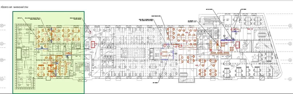 • dispozice zahrnuje 4 velké kanceláře (každá pro až 10 osob), další velkou kancelář, prostornou zasedačku pro 12-16 osob, 2 zasedačky (pro 4 osoby), kuchyňku vybavenou spotřebiči