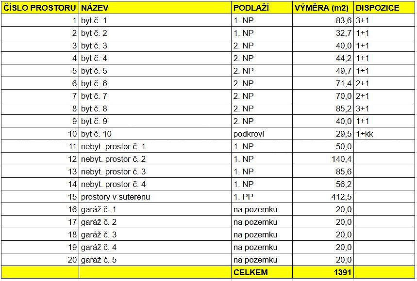 + 10 bytových, 4 nebytové jednotky, prostory v suterénu, 5 garáží
