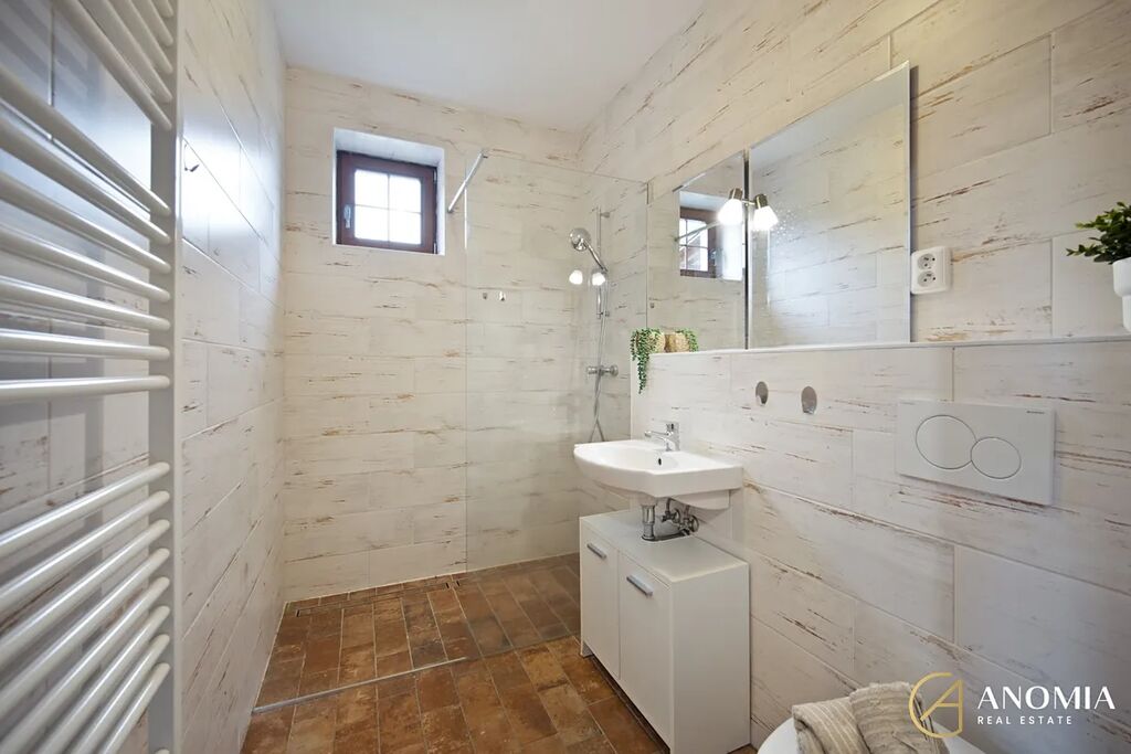 Dominantou přízemí je prostorný obývací pokoj, z kterého je přímý výstup na terasu. Kuchyně je ve venkovském, moderním stylu a v kombinaci s dřevěnými stropy a krbovými kamny působí velice útulným dojmem. Spodní patro doplňují také dva pokoje. Do druhého patra vede elegantní dřevěné schodiště, odkud se dostanete do čtyř samostatných pokojů s krásnými výhledy do okolní přírody. Dům dále disponuje dvěmi koupelnami – jednou se sprchovým koutem a druhou s vanou, technickou místností a čtyřmi prostornými šatnami, které poskytují dostatek úložného prostoru.