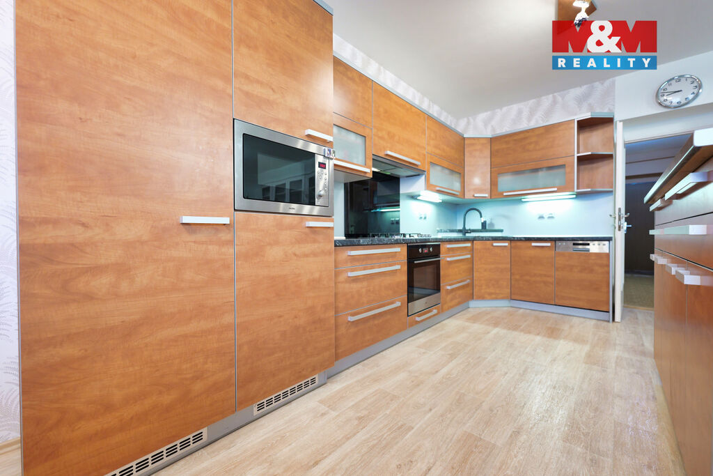 Interiér tvoří kuchyň s linkou na míru se spotřebiči (plynová deska, el. trouba, mikrovlnná trouba, lednice, myčka) a kuchyňským ostrůvkem navazujícím na obývací část se sedačkou, knihovnami a jídelním koutem. Další dva pokoje jsou samostatně přístupné i vzájemně průchozí. K dispozici je prostorná komora, šatna, koupelna s vanou a sprchovou zástěnou, samostatné WC.