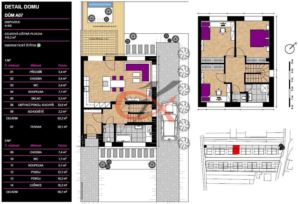 Prodej řadového rodinného domu o zastavěné ploše 84m2 s pozemkem včetně zastavěné plochy 197m2, RD 07. Jedná se o dvoupodlažní skeletový dům o dispozici 4+kk , celková užitná plocha 116,3m2. Dům je situován na ulici Holešovská v nově vznikající lokalitě. V první fázi bude postaveno jedenáct rodinným domů, následně výstavba dalších šesti domů. V přízemí domu se nachází vstupní chodba, centrální chodba se schodištěm do patra domu, koupelna s vanou, samostatná toaleta, obývací pokoj propojený s kuchyní o výměře 34,8m2, z obývacího pokoje je vstup na venkovní terasu, pod schodištěm je komora. V patře domu jsou tři prostorné pokoje, dva o velikosti 16m2 a jeden 12m2, koupelna se sprchovým koutem, samostatná toaleta, prostorná chodba. V domě bude elektrické podlahové vytápění, příprava pro instalaci krbových kamen a vývod pro externí komín. Střešní krytina - plechové šablony, okna plastová trojskla, podlahy linoleum, vnitřní dveře včetně obložek, bojler pro ohřev teplé vody, koupelny budou vybaveny obklady, dlažbou a veškerou sanitou. Příjezd k domu bude řešen zámkovou dlažbou, což umožní vznik parkovacích stání podél domu. Dům bude napojen na veřejný vodovodní řád a kanalizaci, přístup bude zajištěn z obecní komunikace. Dům se nachází přibližně 900m od centra Fryštáku a 8 km (cca 15 minut autem) od Zlína. Dům je ve výstavbě, jeho dokončení je plánováno v prvním kvartálu roku 2026.