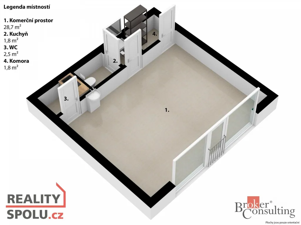 * Komerční prostor: 34,8 m², zkolaudován jako kosmetický salón (možné jiné využití)