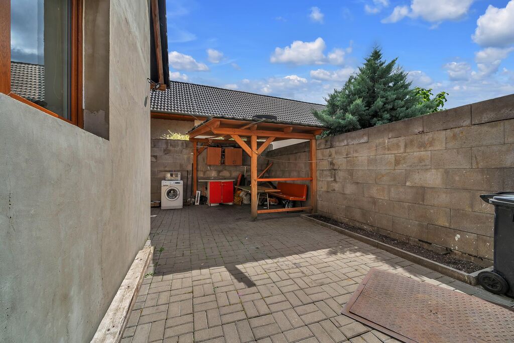 Exteriér domu tvoří menší dvorek s pergolou a zpevněná plocha pro parkování vozidla.