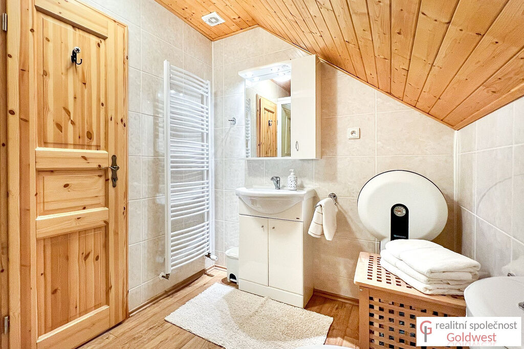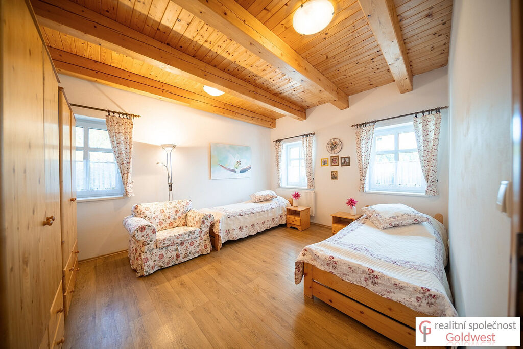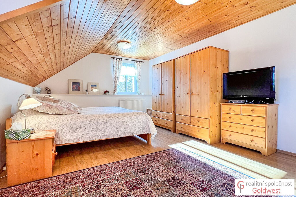 V prvním patře se nachází 4 samostatné velké pokoje, každý s vlastní koupelnu s WC a sprchovým koutem. V patře je umístěna infrasauna, kde můžete relaxovat a užívat si pohody a tepla po celý rok.