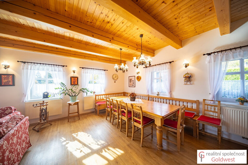 V přízemí se nachází prostorný obývací pokoj s kuchyní a ostrůvkem s barovým pultem, velký jídelní stůl pojme min. 12 osob. Dominantou chalupy jsou stylová kachlová kamna s kvalitní krbovou vložkou značky Brunner, která zdobí obývací pokoj a navozují pocit klidu a domácího pohodlí. Z obývacího pokoje je hezký výhled do krajiny. V přízemí se dále nachází 2 samostatné ložnice, koupelna se sprchovým koutem a WC, kde je nyní také umístěna pračka a sušička. Po obou stranách vstupu najdete velké vestavěné skříně pro uložení oblečení a bot.