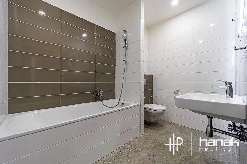 Byt má vysoký standard. Obklady i zařizovací předměty v koupelně jsou značky VilleroyBoch.