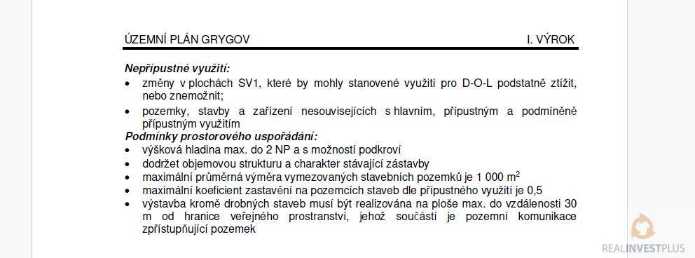 Exkluzivně nabízíme stavební pozemek o výměře 2416m2 (š.18,3m x d.132m)v obci Grygov nedaleko Olomouce. Pozemek je rovinatý orientovaný západním směrem. U pozemku jsou veškeré inženýrské sítě (NN, splašková kanalizace, vodovod, plynovod, optický kabel), asfaltová komunikace. Dle platného územního plánu se pozemek nachází v ploše s regulativem (SV) - plochy smíšené obytné - venkovské (více informací ve fotogalerii). Pozemek je vhodný jak pro trvalé bydlení (rodinný dům), ale i jako investice - možnost výstavby bytového domu se 4 byty; v místě škola, školka, obchod, pošta. Pro informace o ceně, popř. k prohlídce pozemku, volejte realitního makléře p.Záhumenského Libora