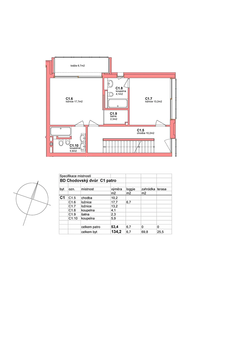 Jeho dispozice zahrnuje tři ložnice, z nichž každá má vlastní koupelnu, prostorný obývací pokoj propojený s plně vybavenou a moderní kuchyní, samostatnou toaletu, chodby a šatnu. Kuchyň je vybavena moderními spotřebiči, jako je varná deska, vestavěná lednice s mrazákem, mikrovlnná trouba, elektrická trouba a myčka nádobí. Obývací pokoj je prostorný, s přímým vstupem na zahradu s terasou o ploše 70 m², která poskytuje ideální místo pro trávení společných chvil na čerstvém vzduchu. Ložnice v posledním podlaží navíc disponuje terasou o velikosti 25,5 m², která nabízí nádherný výhled do sousedního parku. Byt dále disponuje uzavřenou lodžií (6,7 m²) a sklepem (4 m²). Součástí bytu jsou také dvě parkovací stání v garáži.