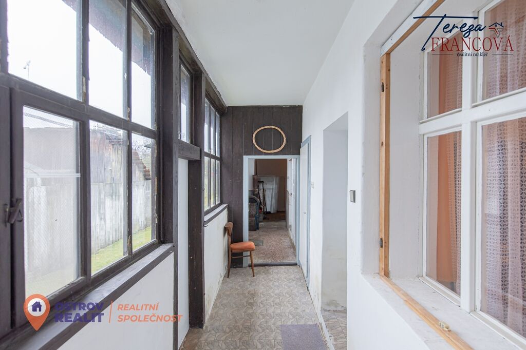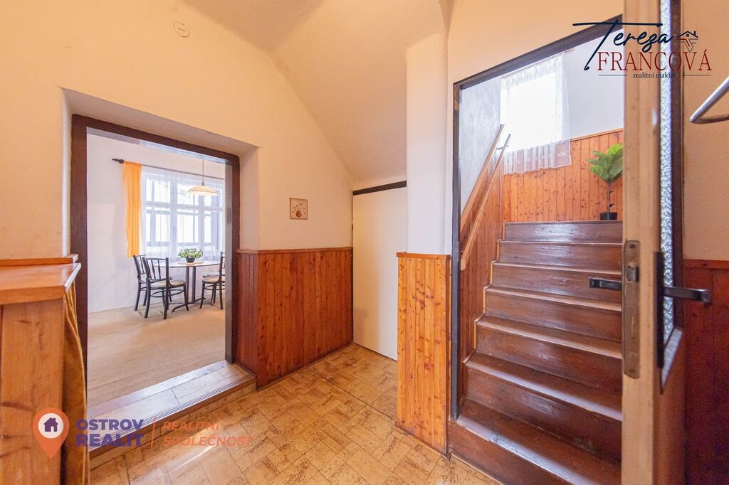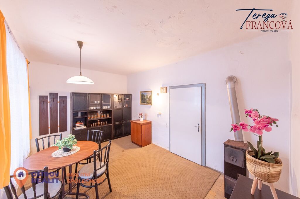 Po vstupu do domu vás uvítá vstupní předsíň se vstupem do garáže, kde pohodlně zaparkujete. Zádveří navazuje na spíž, kterou lze upravit například na další koupelnu. Chodba vede do velké jídelny s kuchyňským koutem, na který navazuje pokoj s výhledem na zahradu. Odtud se dostanete i k dřevěnému schodišti do podkroví, kde je umístěn prostorný pokoj s krásným výhledem do okolí. V přízemí dále najdete samostatný pokoj a další místnost průchozí na prosklenou verandu – ideální pro zimní zahradu či klidové posezení. Koupelna se sprchovým koutem a WC je situována poblíž schodiště, v blízkosti dalších místností vhodných jako komory či dílna.