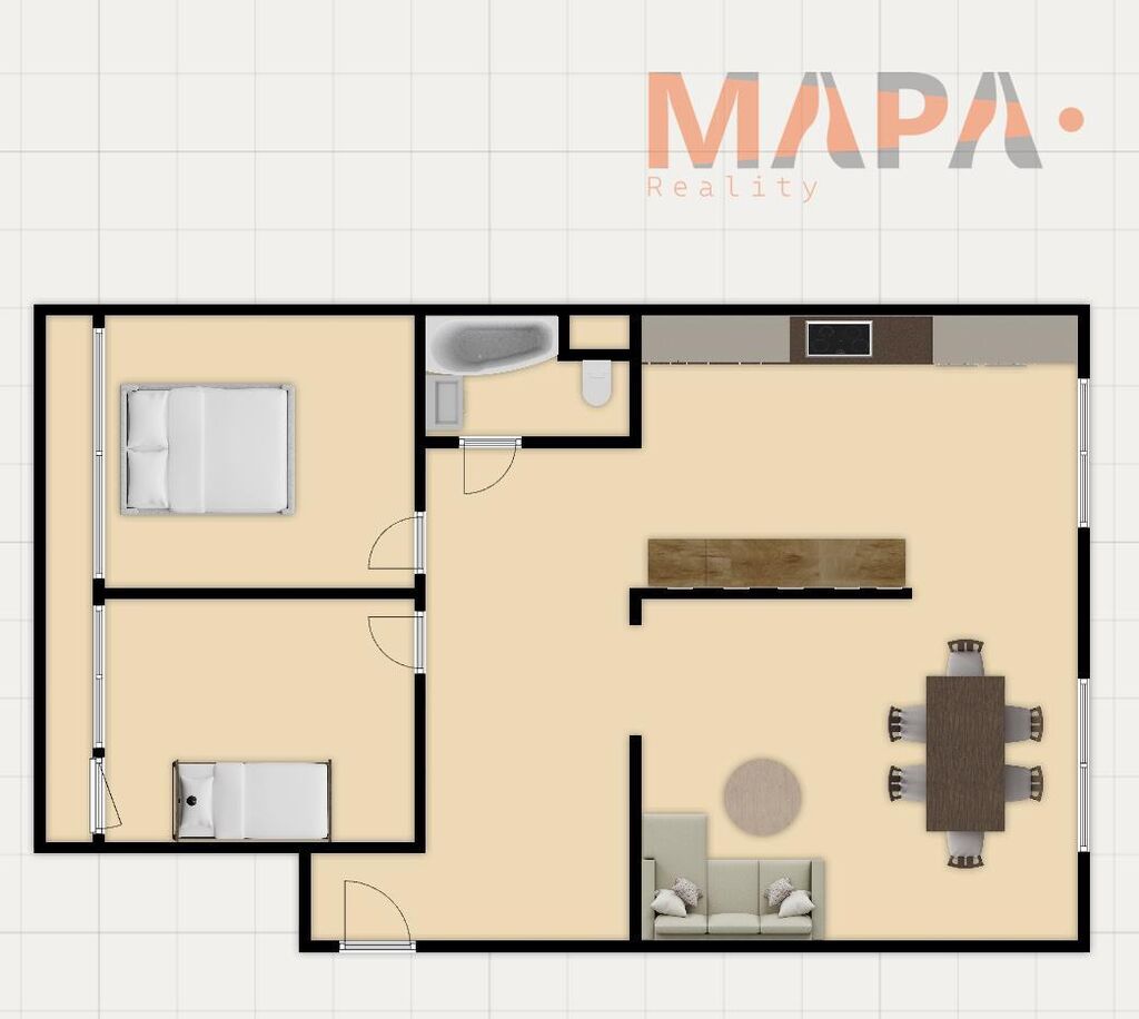 V bytě je útulná a moderně zařízená kuchyň s příjemným jídelním koutem. V obývacím pokoji můžete relaxovat po náročném dni a vychutnat si společné chvíle s rodinou nebo přáteli. Dva pokoje přístupné z chodby nabízejí dostatek soukromí a klidu pro odpočinek. Jeden pokoj může sloužit jako pracovna nebo dětský pokoj a druhý ložnice.