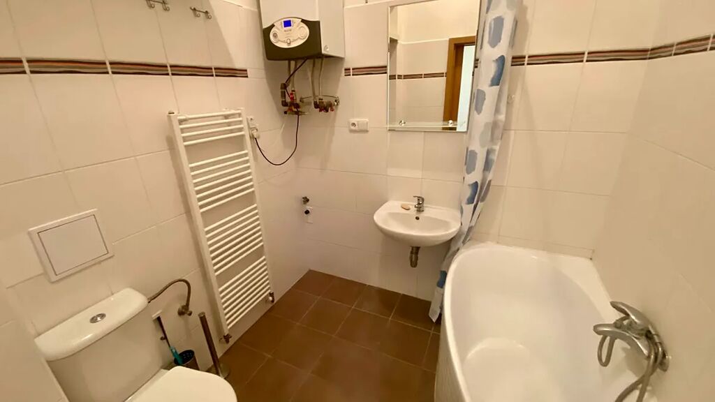 Plynový kotel pro vlastní vytápění a ohřev vody, radiátory, sanitární keramika a vodovodní baterie.