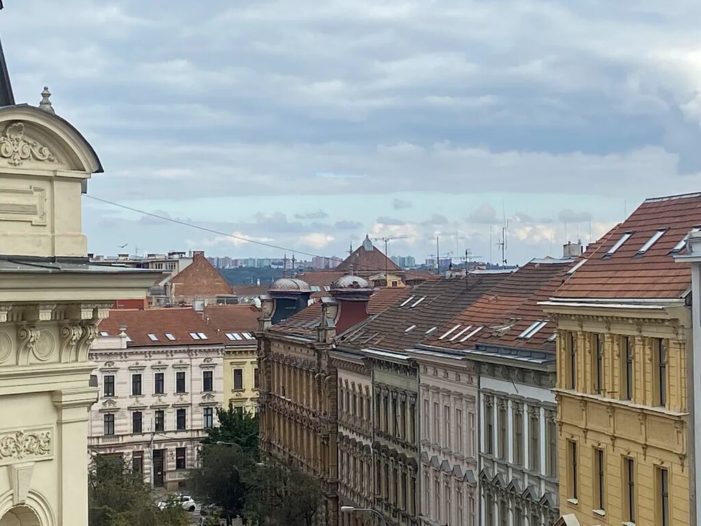 Pronájem prostorného bytu 2+1 o ploše 73 m2 v historickém domě u centra města s výhledem na hrad Špilberk. Secesní dům s bohatou fasádou se štukami, byt s vysokými stropy a velkými dvoukřídlými dveřmi a velkými kastlovými okny.