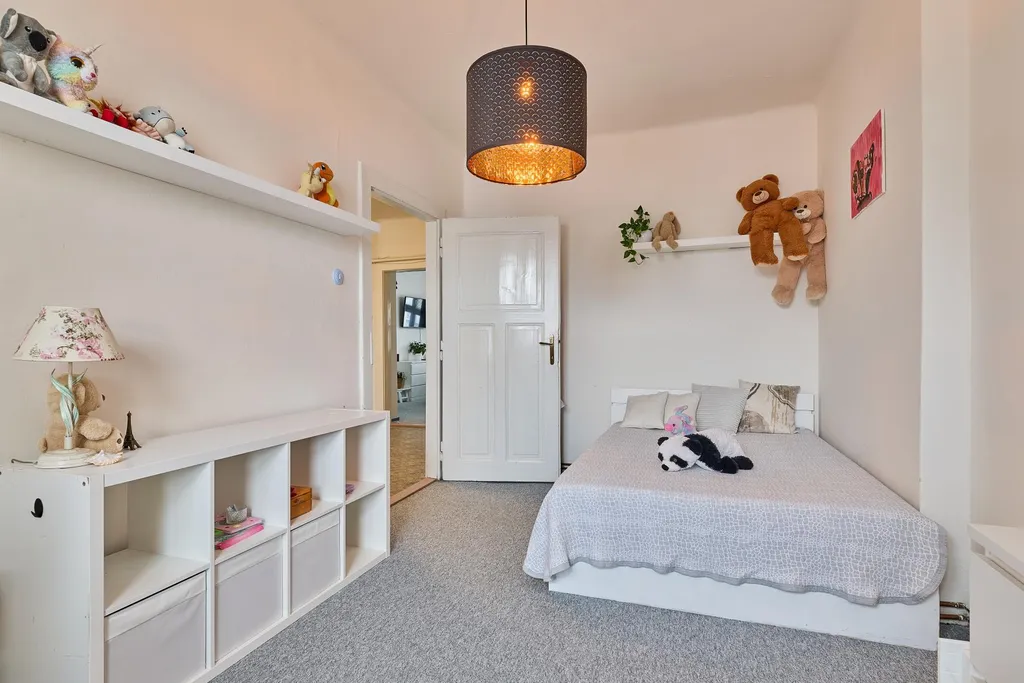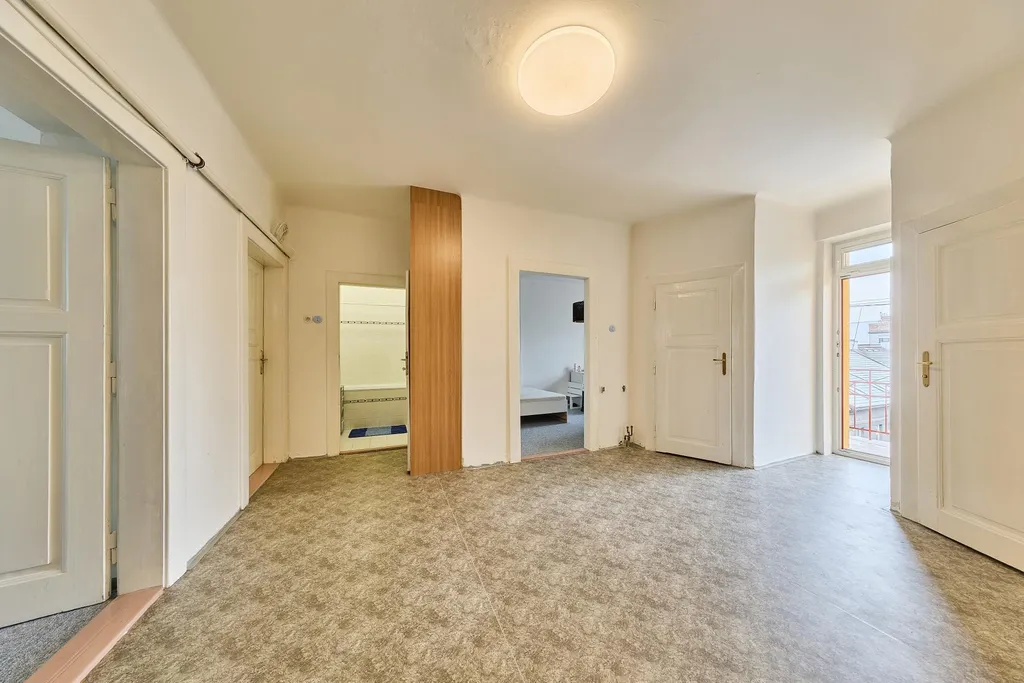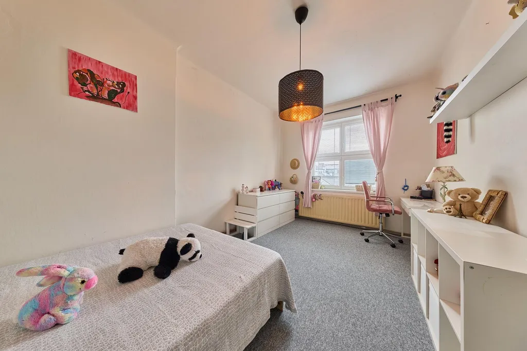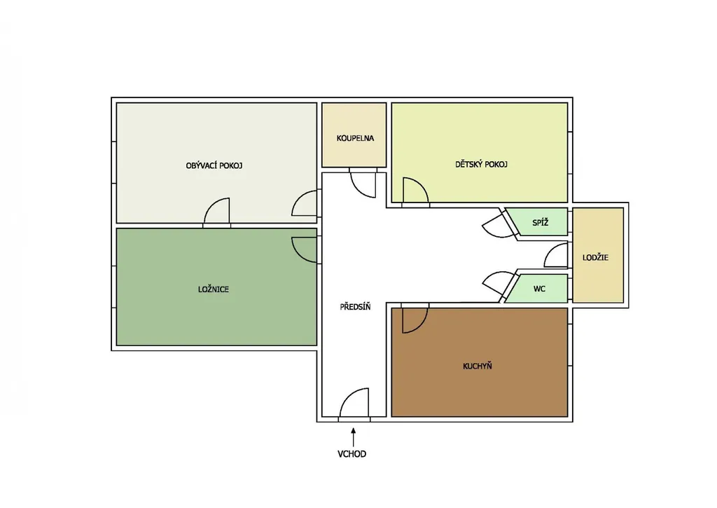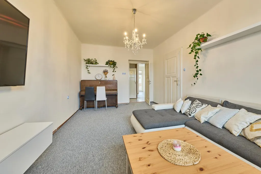 Dispozice bytu: velmi prostorná předsíň se vstupem na lodžii, obývací pokoj, kuchyně s kuchyňskou linkou se spotřebiči, ložnice, dětský pokoj, koupelna s vanou, samostatná místnost WC, spíž. K bytu náleží velký sklep umístěný v suterénu domu. Byt je aktuálně s novými podlahovými krytinami (lino, koberce) a zcela novým plynovým kotlem, který zajišťuje vytápění a ohřev teplé vody. PENB E.