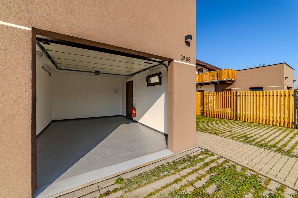 1 vůz v garáži, další 1 vůz na parkovacím místě vedle garáže za posuvnou bránou.