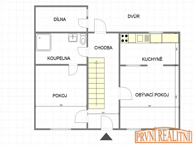 přízemí - chodba, 2 pokoje a kuchyňský kout, koupelna se sprchovým koutem a WC