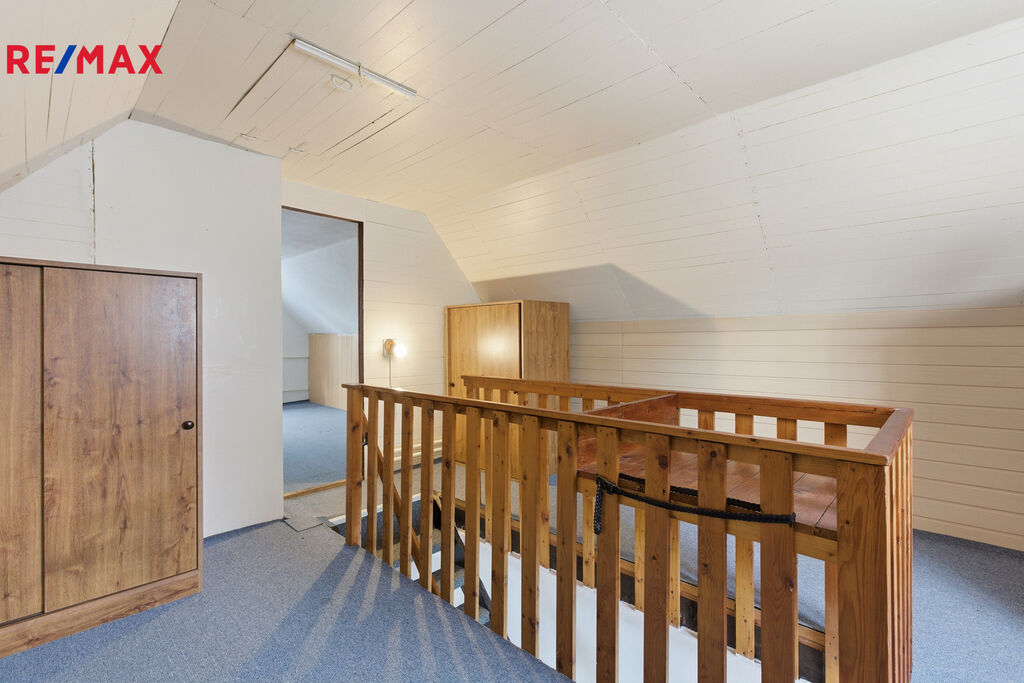 Dále se po schodech dostanete buď do sklepu, který jistě oceníte pro uchovávání potravin, a nebo do horního patra tvořeného jedním prostorným pokojem a útulnějším mezipokojem se zmíněnými schody.