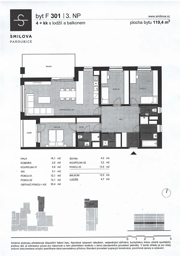 Jedná se o byt 4+KK s lodžií a balkónem, s božským výhledem na Machoňovu pasáž, a parkovacím stáním a sklepem (komora).