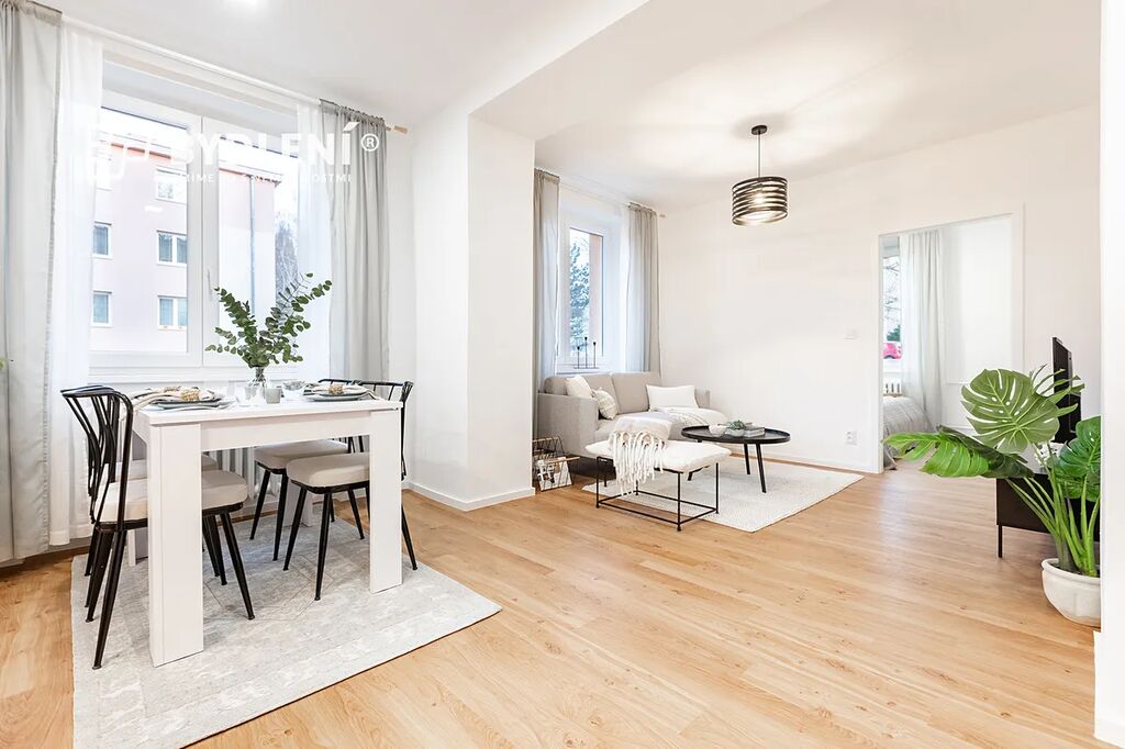 Byt prošel kompletní a vkusnou rekonstrukcí. Obývací pokoj s kuchyňským koutem se spotřebiči Bosch působí světlým dojmem a nabízí příjemné společné zázemí. Také zděná koupelna je kompletně nová, se samostatnou toaletou. Menší pokoj je ideální jako dětský pokoj, pracovna nebo úložný prostor. Ložnice poskytne útulné a klidné místo pro odpočinek. K bytu náleží sklepní kóje (2 m²). Provozní náklady činí cca 3 390 Kč/měs. + elektřina od cca 800 Kč / měs.