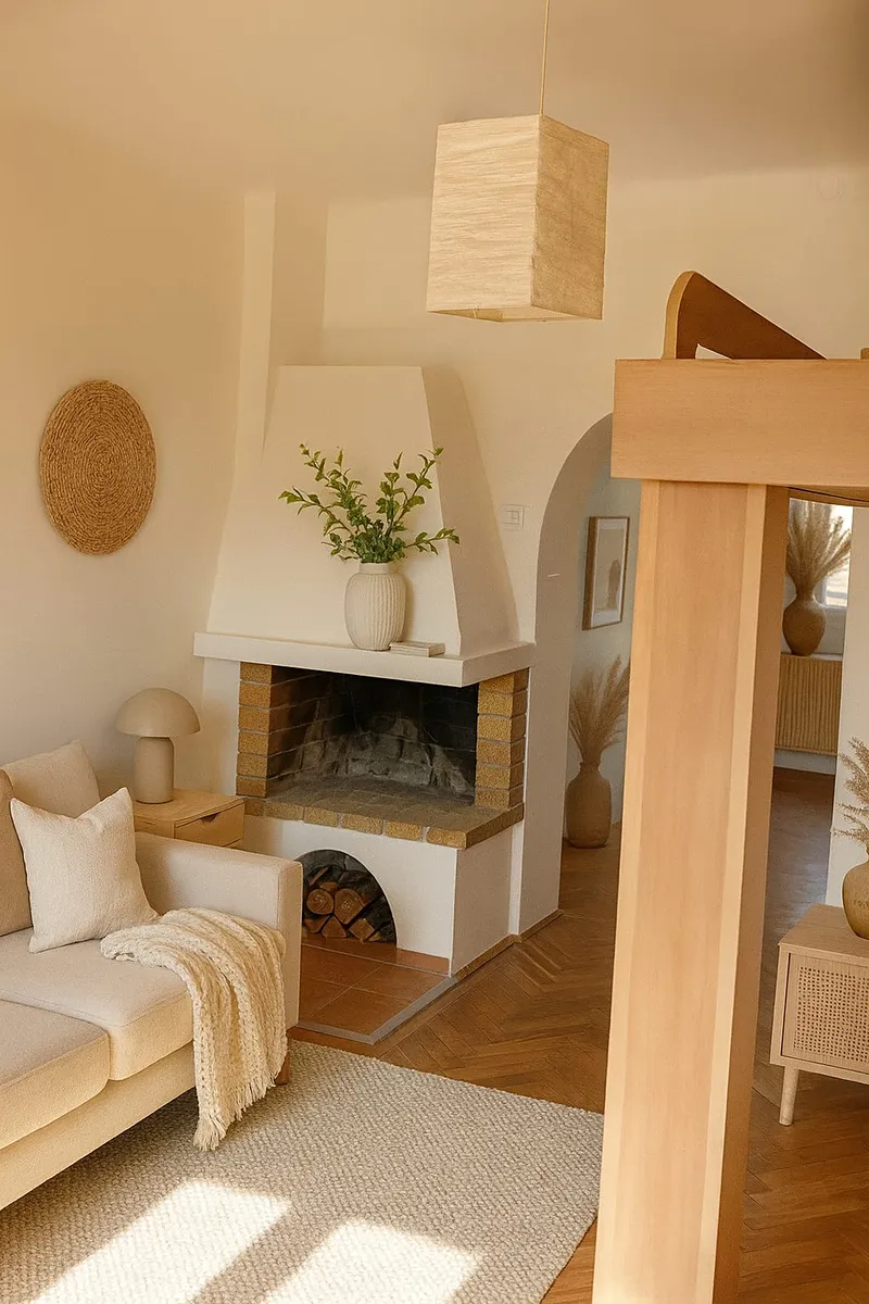-obývací pokoj s vestavným patrem a funkčním krbem