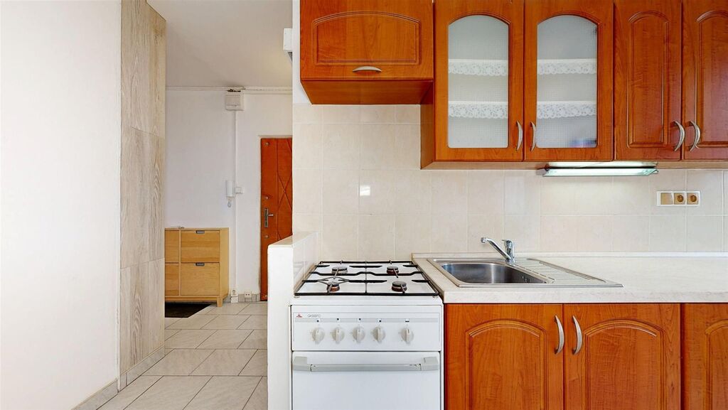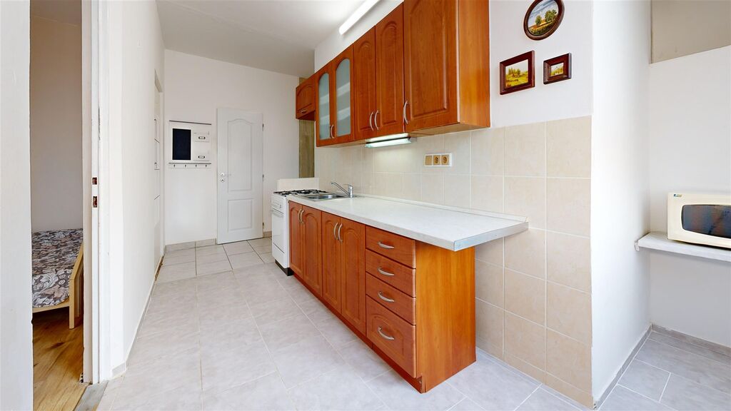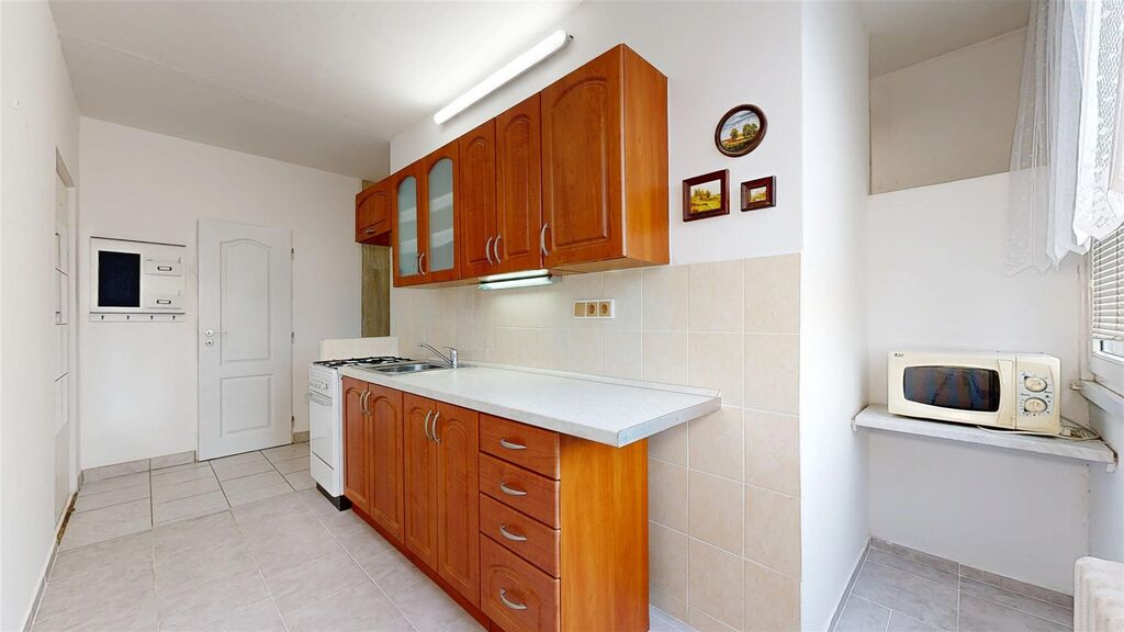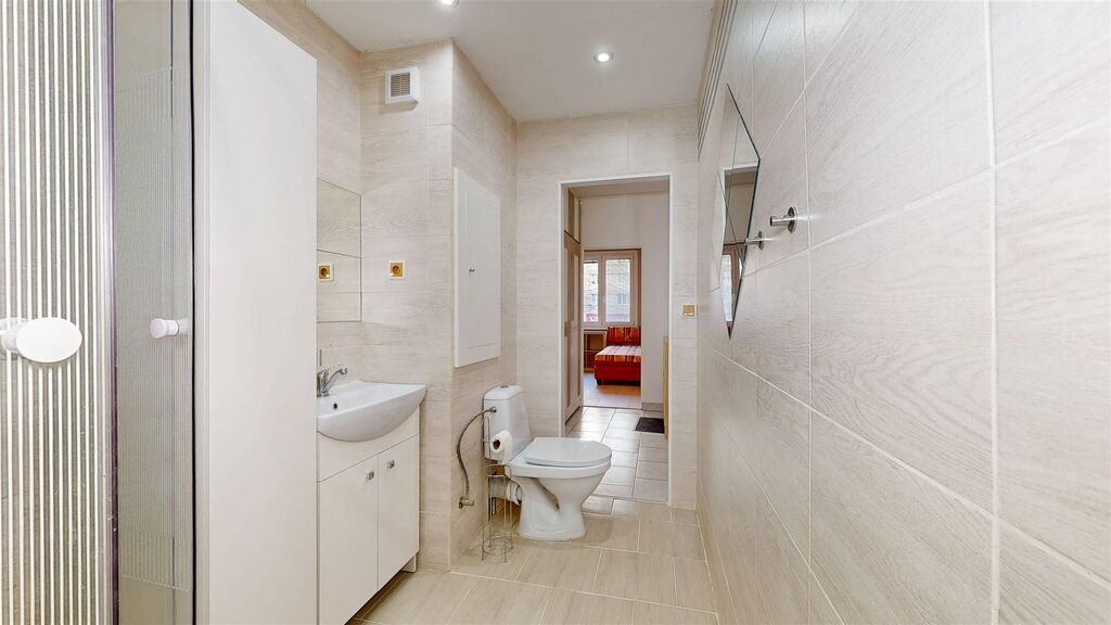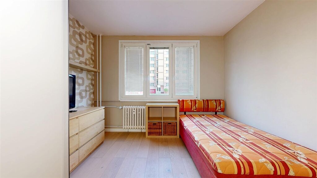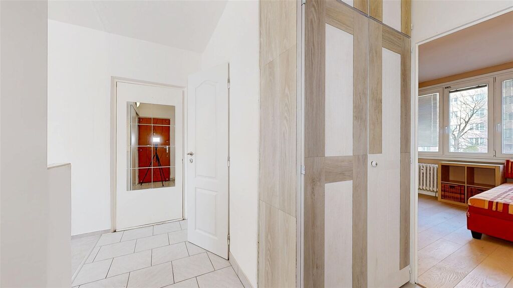 Byt je kuchyní a pokojem orientován k jihozápadu, je tedy velmi světlý a poskytuje velmi pěkný výhled. V bytě je zděné jádro, nová koupelna se sprchovým koutem a pračkou, plastová okna, na podlahách dlažba a v pokojích dřevo, kuchyňská linka zánovní. V bytě je několik praktických a také zánovních kusů vybavení, které by mohlo přijít vhod potenciálním nájemníkům viz fotografie. Dům je zateplený, má nová stoupací vedení i výtah, je úsporný, velmi dobře udržovaný a spravovaný. V bytě je praktická šatna, k bytu patří dále komora v mezipatře, sklepní kóje a užívání malého balkonu také v mezipatře.