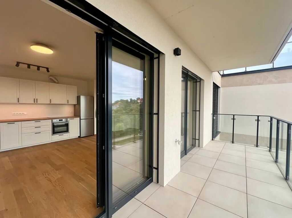 Byt se nachází v novostavbě s vysokým standardem vybavení a moderní architekturou. Dispozici tvoří prostorný obývací pokoj s plně vybavenou novou kuchyňskou linkou, ložnice, koupelna s vanou a toaletou, předsíň a velká komora s přípojkou na pračku (pračka je k dispozici na požádání). Vybavení zahrnuje: klimatizaci v obou pokojích, elektrické venkovní žaluzie, dřevěné podlahy a velkoformátovou dlažbu, bezpečnostní vstupní dveře, přípravu pro vysokorychlostní internet. Z prostorné terasy si můžete vychutnat klid a dechberoucí výhled na panorama Prahy.