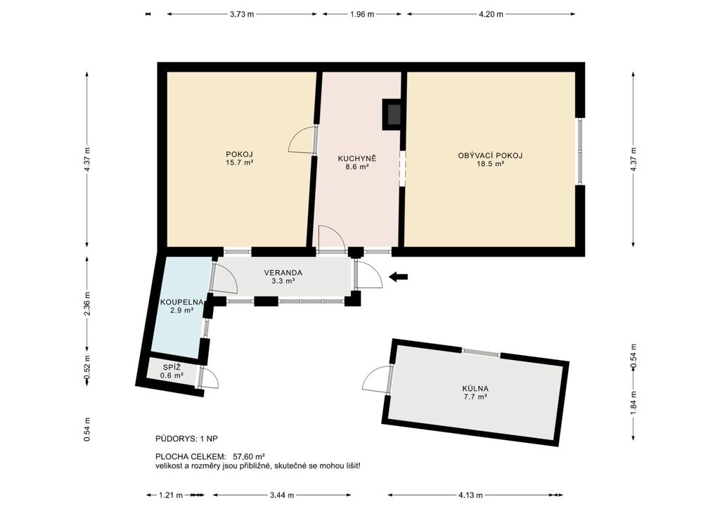Domek je ze smíšeného zdiva a sloužil k trvalému bydlení. Je napojený na veškeré dostupné IS elektřinu, vodovod a kanalizaci, plyn není. V přízemí se nachází 2 pokoje, kuchyňka, předsíň a malá koupelna se sprchovým koutem, v patře, přístupném po venkovních schodech, je pak další, letní pokoj, otevřená terasa a půda. Ze dlážděného dvora vejdete do venkovní komory a kůlny/dílny. Ulička, v níž se domek nachází, je přístupná autem do vzdálenosti cca 10 m od domku, pak už jen pěšky. Zaparkujete však velmi blízko v příjezdové ulici cca 80 m od domku.
