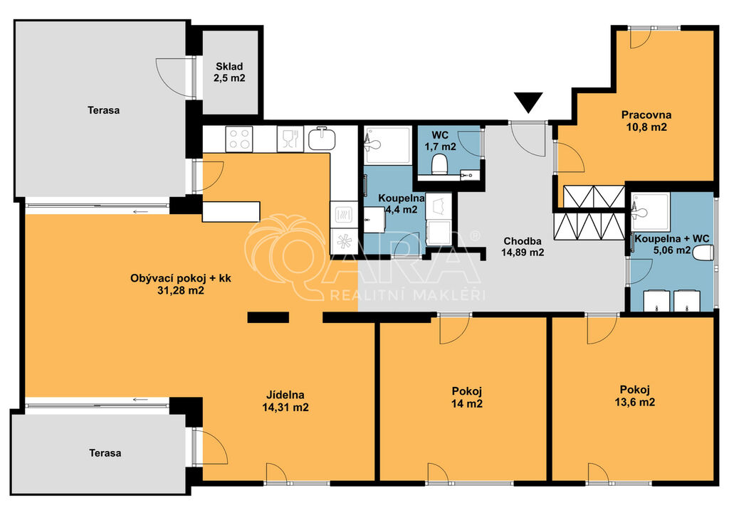 Byt tvoří prostorný obývací pokoj s jídelnou (45,59 m²), dvě samostatné ložnice (14 m² a 13,6 m²), další pokoj/pracovna (10,8 m²), předsíň (14,89 m²), koupelna s vanou (4,4 m²), druhá koupelna se sprchou a WC (5,06 m²) a samostatné WC (1,7 m²).