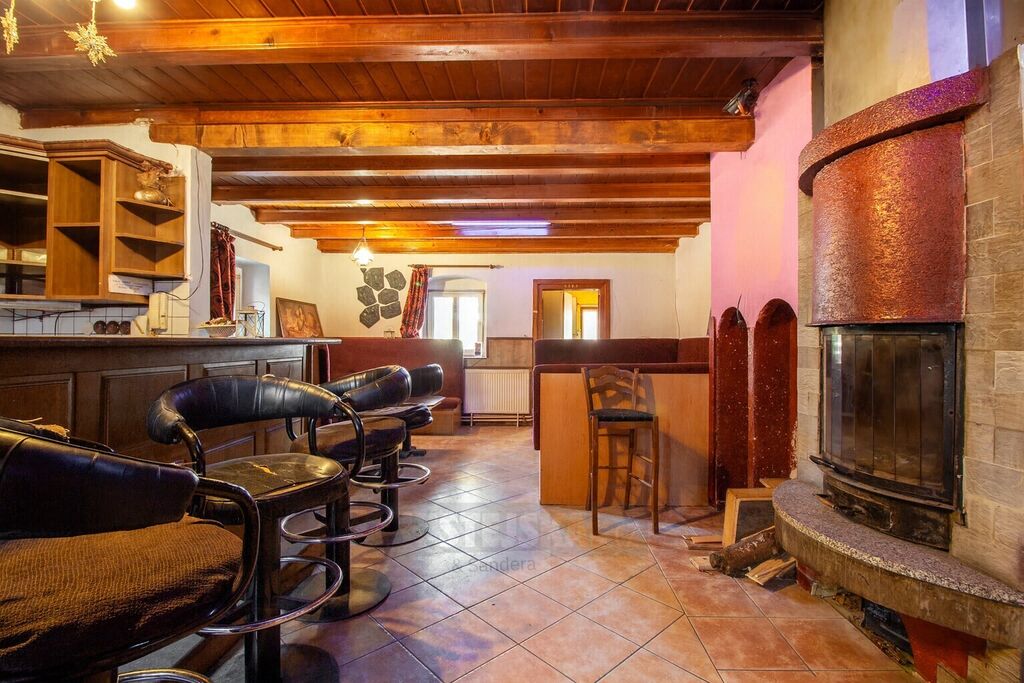 Dispozice:1.NP (přízemí): recepce s posezením a barem a kamny s krbovou vložkou, sociální zázemí pro personál i hosty, prostorná a vybavená kuchyně, technická část - místnost s bojlery a místnost s automatickým kotlem na peletky, který zajišťuje vytápění i ohřev vody, záložním zdrojem je el. kotel, dále v přízemí samostatný vstup a byt či větší apartmán s koupelnou a vanou, vstupní hala se schodištěm do podkroví.
