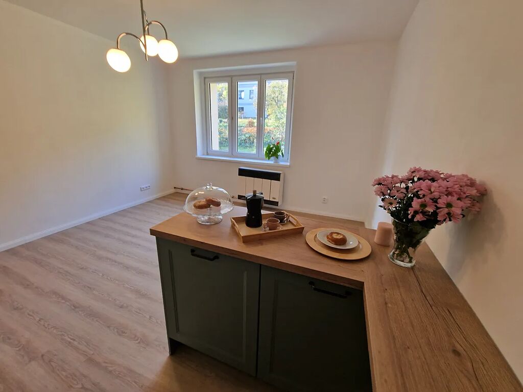 Byt má zděnou koupelnu se sprchovým koutem a je dále vybaven pěknou kuchyňskou linkou s el.troubou, varnou deskou, digestoří, lednicí, umyvadlovou skříňkou v koupelně, skříní na chodbě a svítidly ve všech místnostech. Provedena izolace stropů. Ihned dostupné.