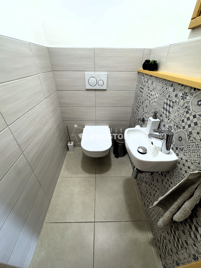 V přízemí se nachází samostatná kuchyň, velmi prostorný obývací pokoj, ložnice, koupelna se sprchovým koutem a WC a také další samostatné WC. Celý interiér je laděn do jednotného moderního stylu se světlými tóny dlažeb a dřeva, včetně dveří a obložek.