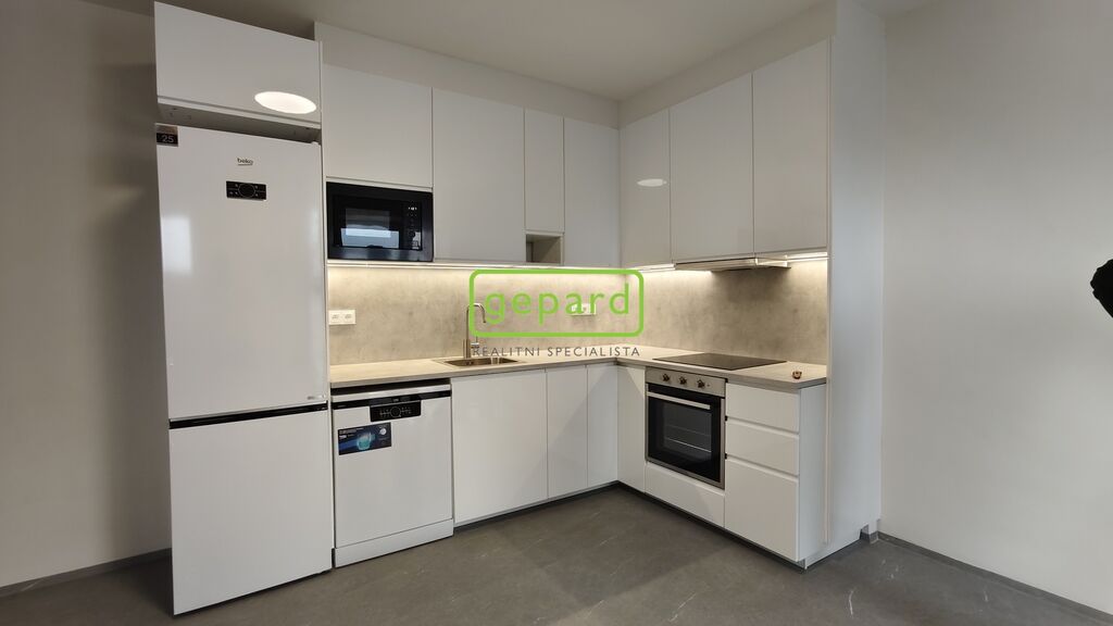Byt je umístěný ve zvýšeném přízemí a je tvořen halou, chodbičkou, koupelnou se sprchou a WC, obývacím pokojem s kuchyňským koutem, dvěma ložnicemi a balkonem. Je vybaven kuchyňskou linkou se spotřebiči (indukční varná deska, horkovzdušná elektrická trouba, digestoř, mikrovlnná trouba, lednice s mrazákem, myčka) a pračkou. Vytápění bytu elektrickým podlahovým topením, ohřev vody elektrickým boilerem. Na oknech jsou elektricky ovládané předokenní žaluzie.