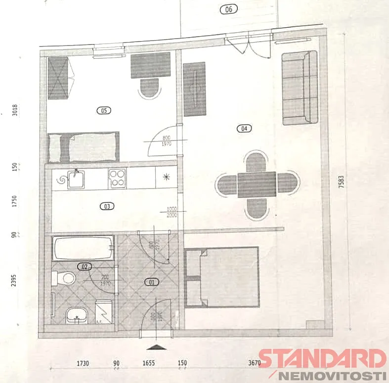 - obývací pokoj 27,58 m2: sedací souprava, konferenční stůl, jídelní stůl, komoda; francouzské okno se vstupem na balkón s výhledem do krajiny; oddělená spací zóna s dvoulůžkem