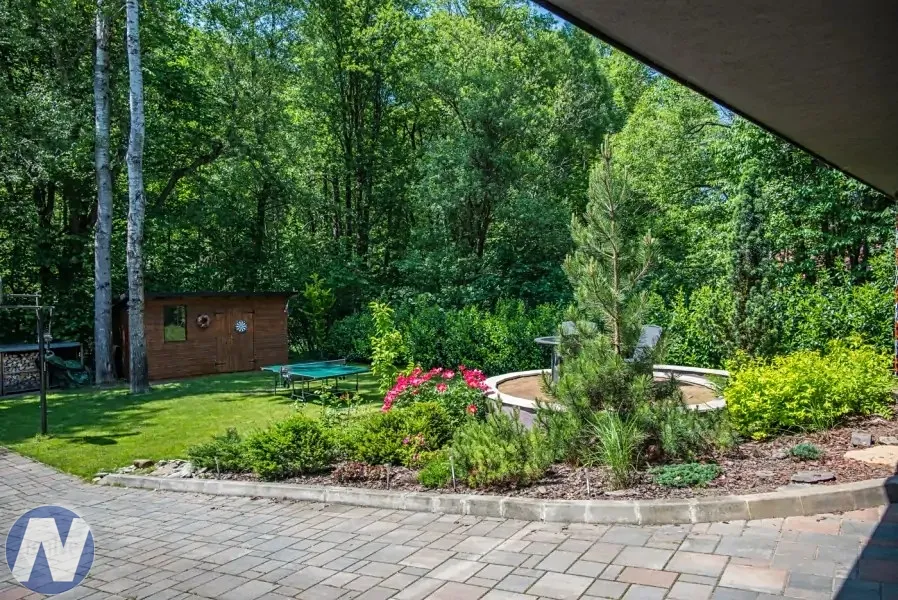 Pod domem je prostorná dvojgaráž s vraty na elektrický pohon a dostatkem skladovacích prostor pro sportovní vybavení. Za domem stojí dřevěný zahradní domek, jež slouží pro uložení zahradního nábytku a grilovacího náčiní.
