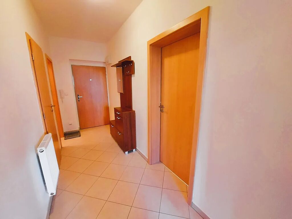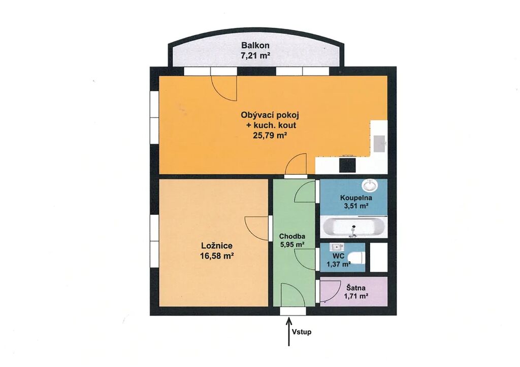 Byt tvoří vstupní chodba 5,95 m² , ložnice 16,58 m² , obývací pokoj s kuchyňským koutem 25,79 m² , balkon 7,21 m² , koupelna s vanou 3,51 m² , WC 1,37 m² , šatna 1,71 m². Součástí je také sklep 2m² situovaný v přízemí bytového domu, kde je k dispozici také kočárkárna a úklidová místnost. V kuchyni je umístěna kuchyňská linka s digestoří, vestavěnou elektrickou troubou a varnou deskou, lednicí a mikrovlnou troubou, v koupelně vana se zástěnou, umyvadlo a police, na chodbě předsíňová stěna. Dalším bonusem tohoto bytu je vedení optiky, což je zárukou kvalitního a stabilního internetového připojení.